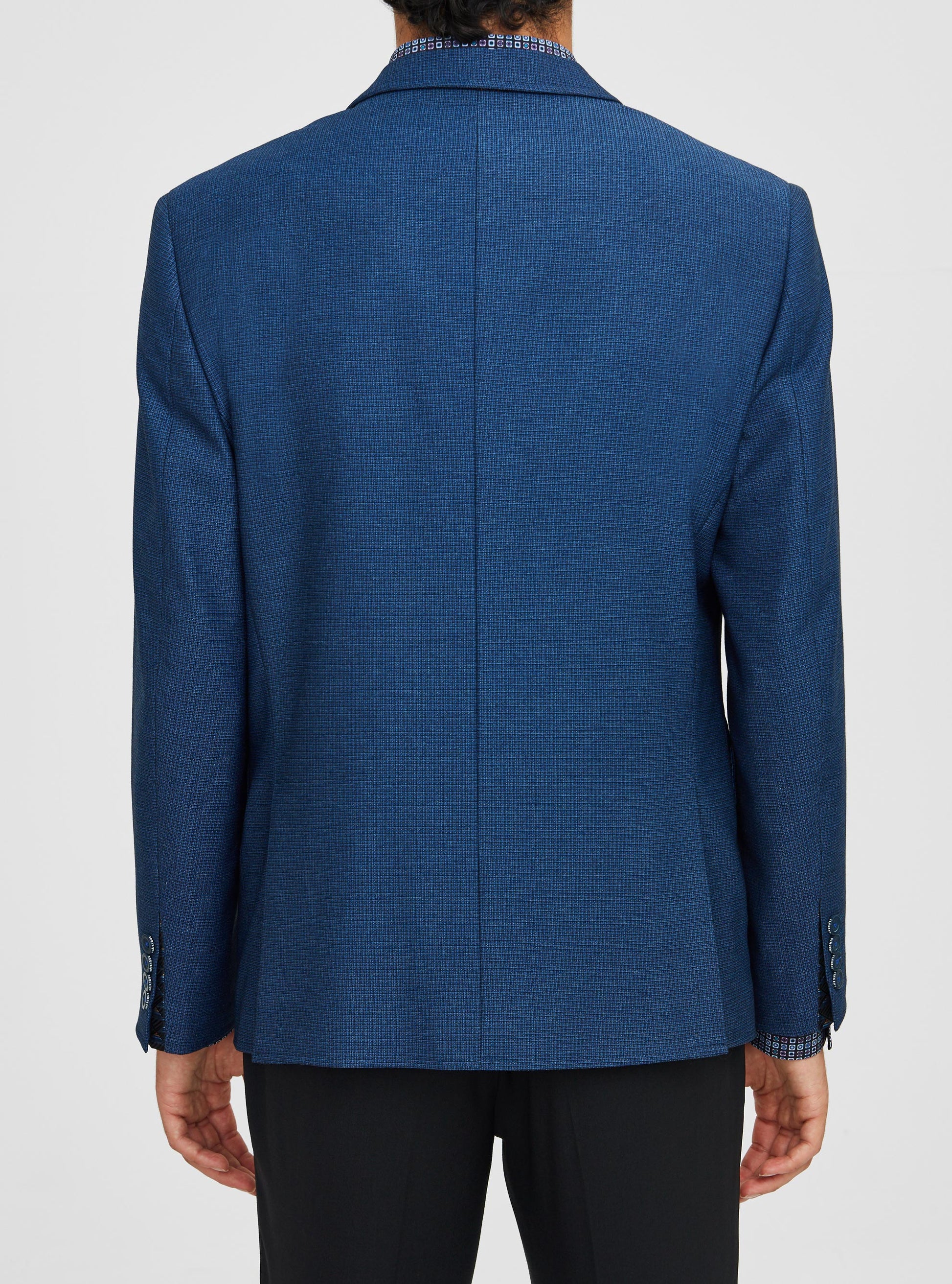 This men's stretch blazer is crafted from a mini check knit fabric, featuring contrasting trims for a touch of style. Its flexible construction, complete with stretch lining and shoulder insert, ensures maximum comfort and movement.