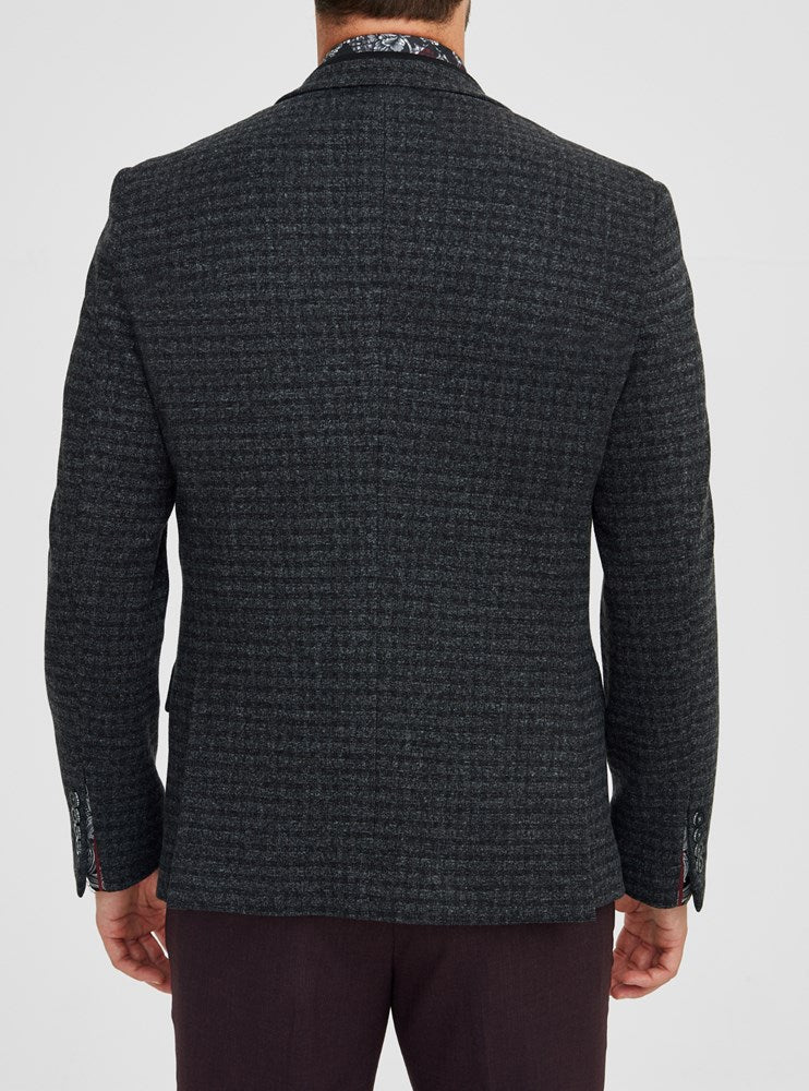 Men's tailored stretch blazer crafted from mini brushed plaid knit fabric with inside collar trim and stretch armholes for superior comfort. This blazer blends refined craftsmanship with modern comfort, perfect for any discerning wardrobe.