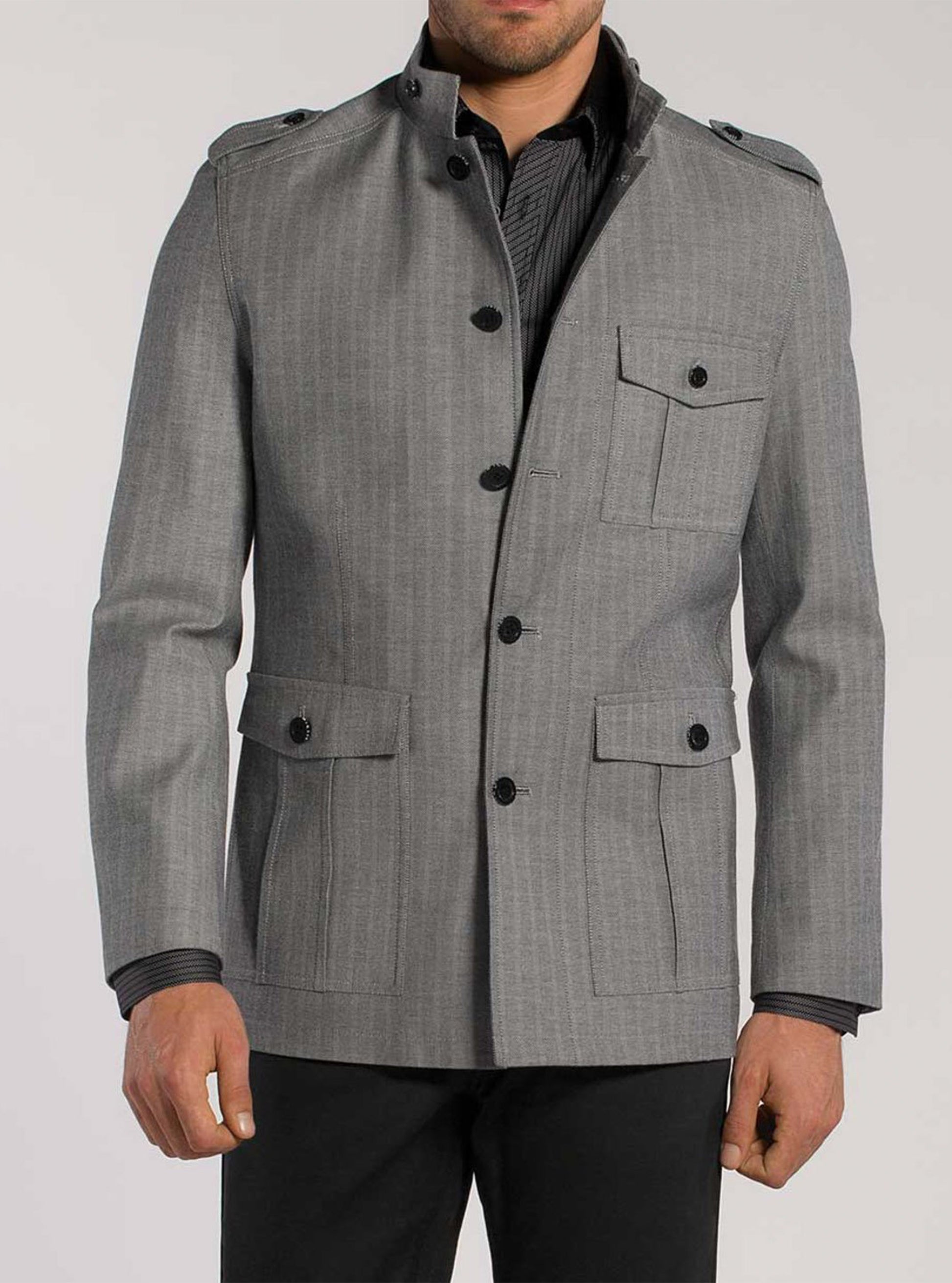 Elevate your style with this men's stretch safari jacket featuring a classic Mao collar, functional attachable pockets, and stylish elbow patches. Perfect for versatile, comfortable, and sophisticated outdoor or casual wear.