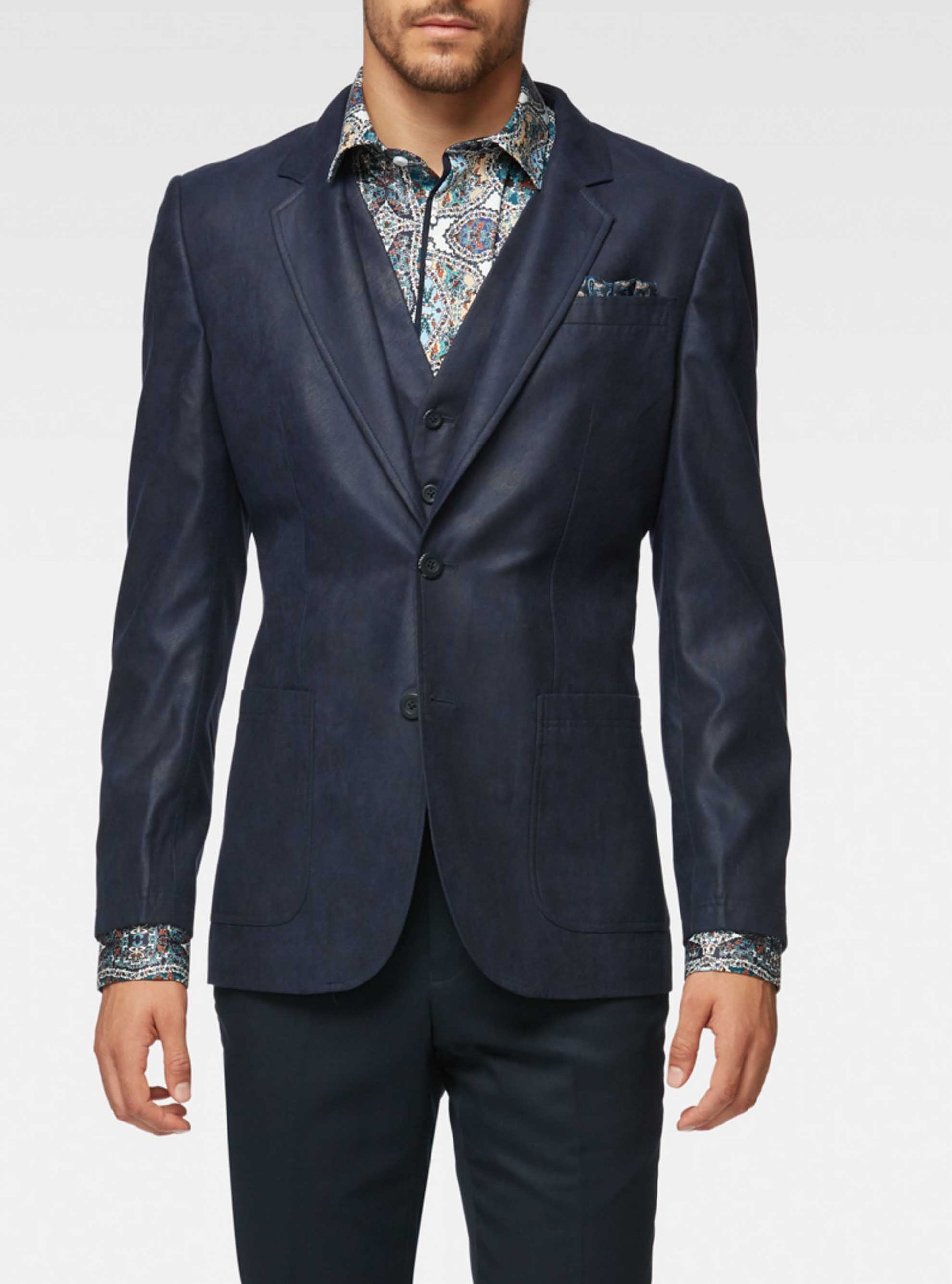 Men’s blazer crafted from premium faux leather, accented with sleek contrast trims and featuring a removable vest fooler for versatile styling. Designed with a flexible armhole for superior comfort and effortless movement.