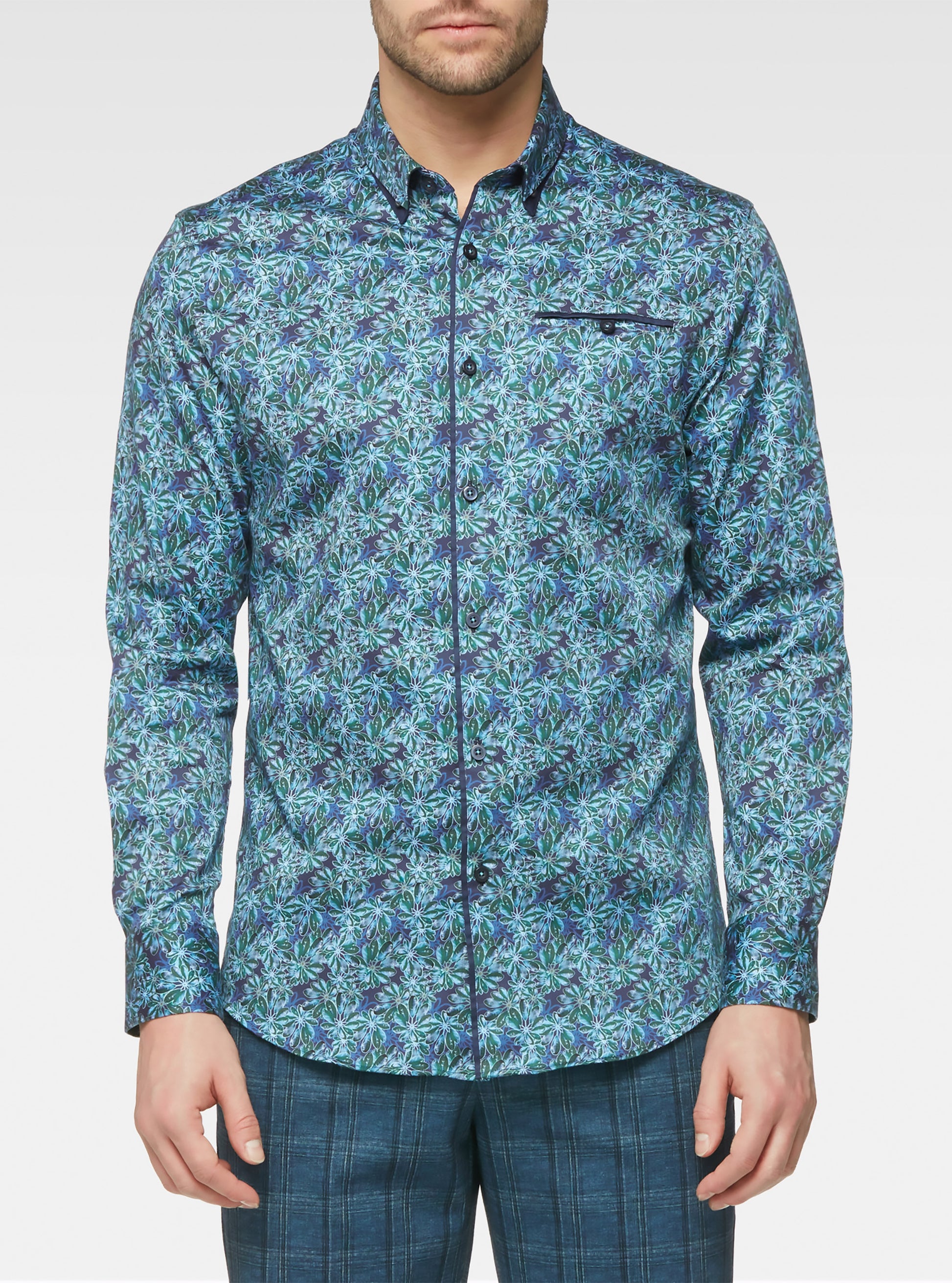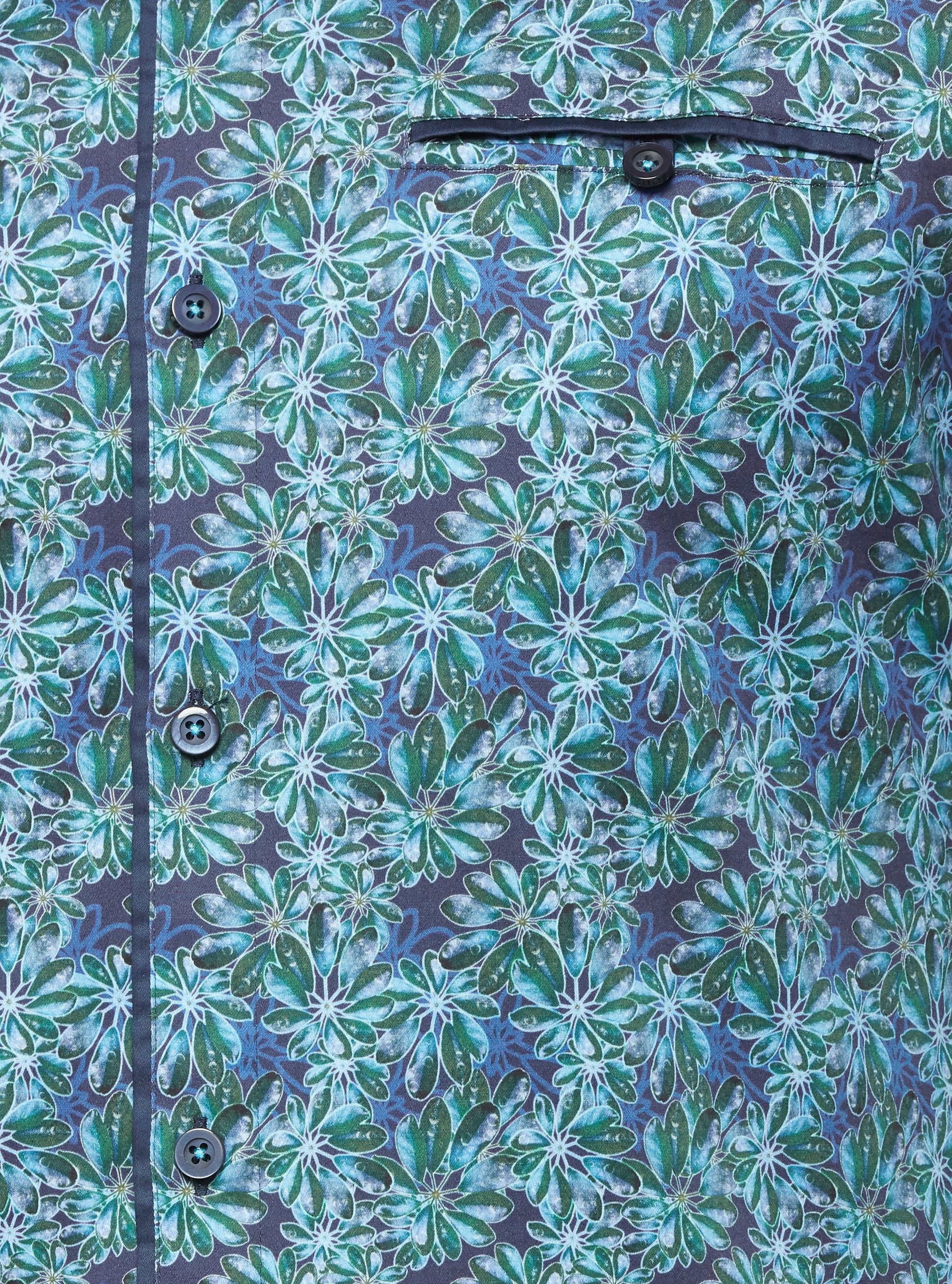 Bring nature-inspired style to your wardrobe with this men’s mercerized cotton-spandex shirt. Featuring a dew-on-leaves print, sharp contrast inserts, and refined collar tipping for standout appeal.