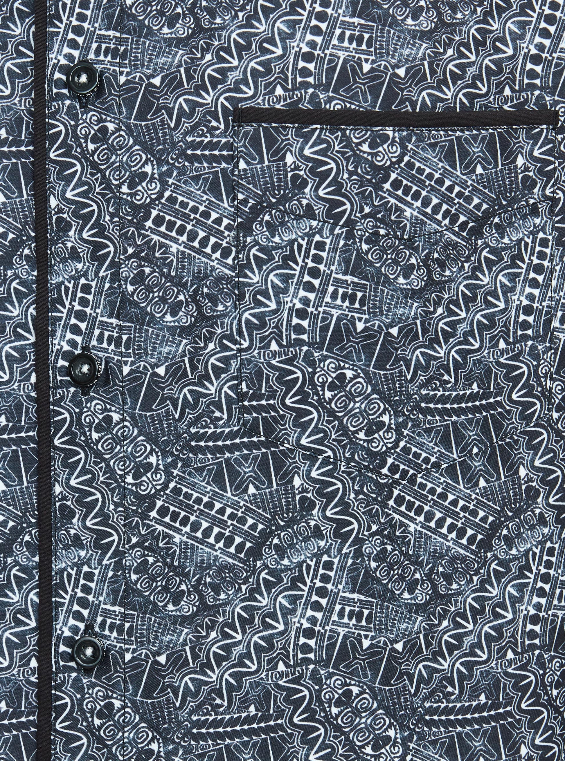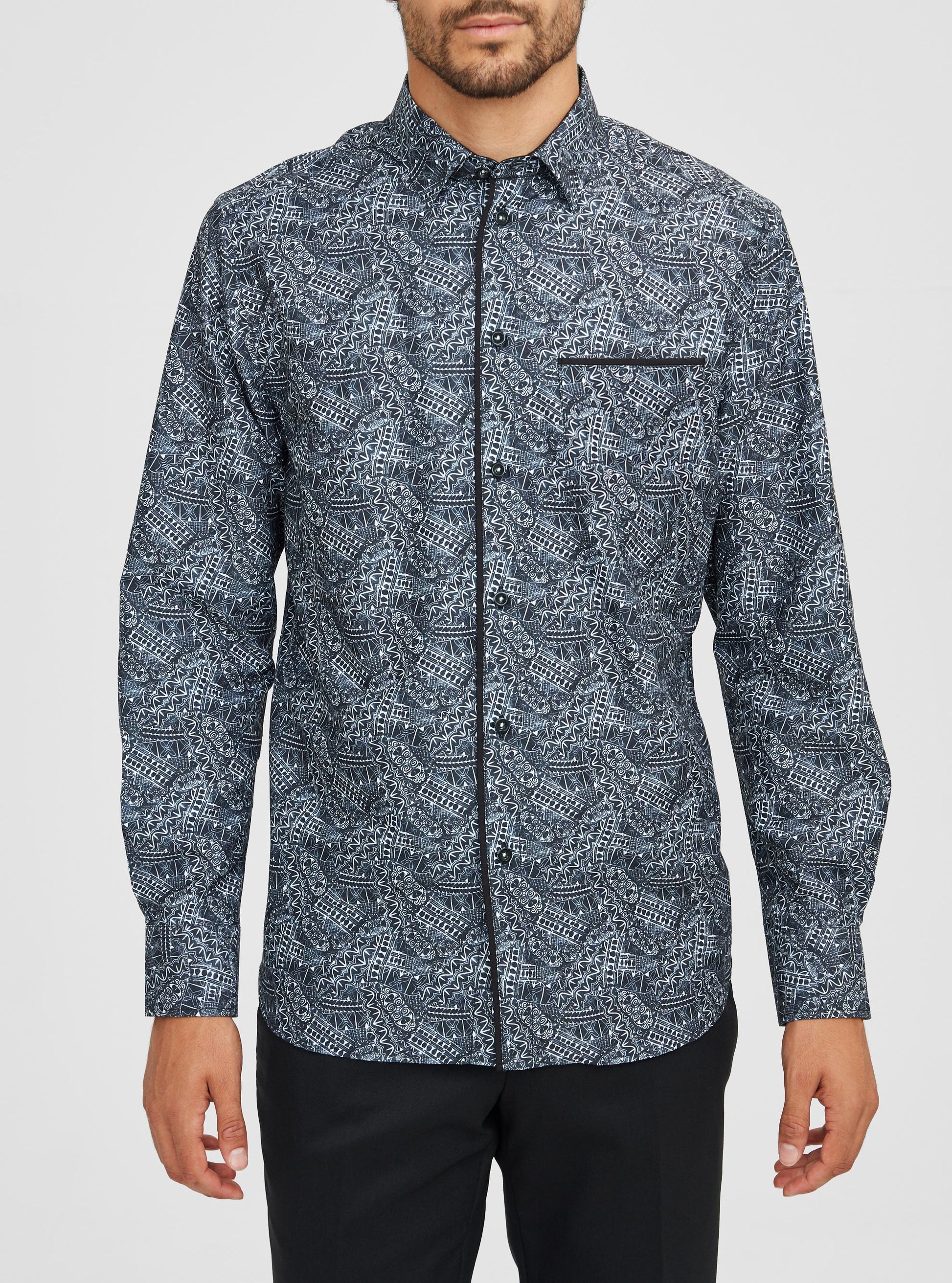 Revamp your wardrobe with this men's long sleeve shirt, featuring a unique native stamp print and contrasting inserts. Perfect for making a statement, it combines comfort and style effortlessly. Ideal for both casual and semi-formal occasions.