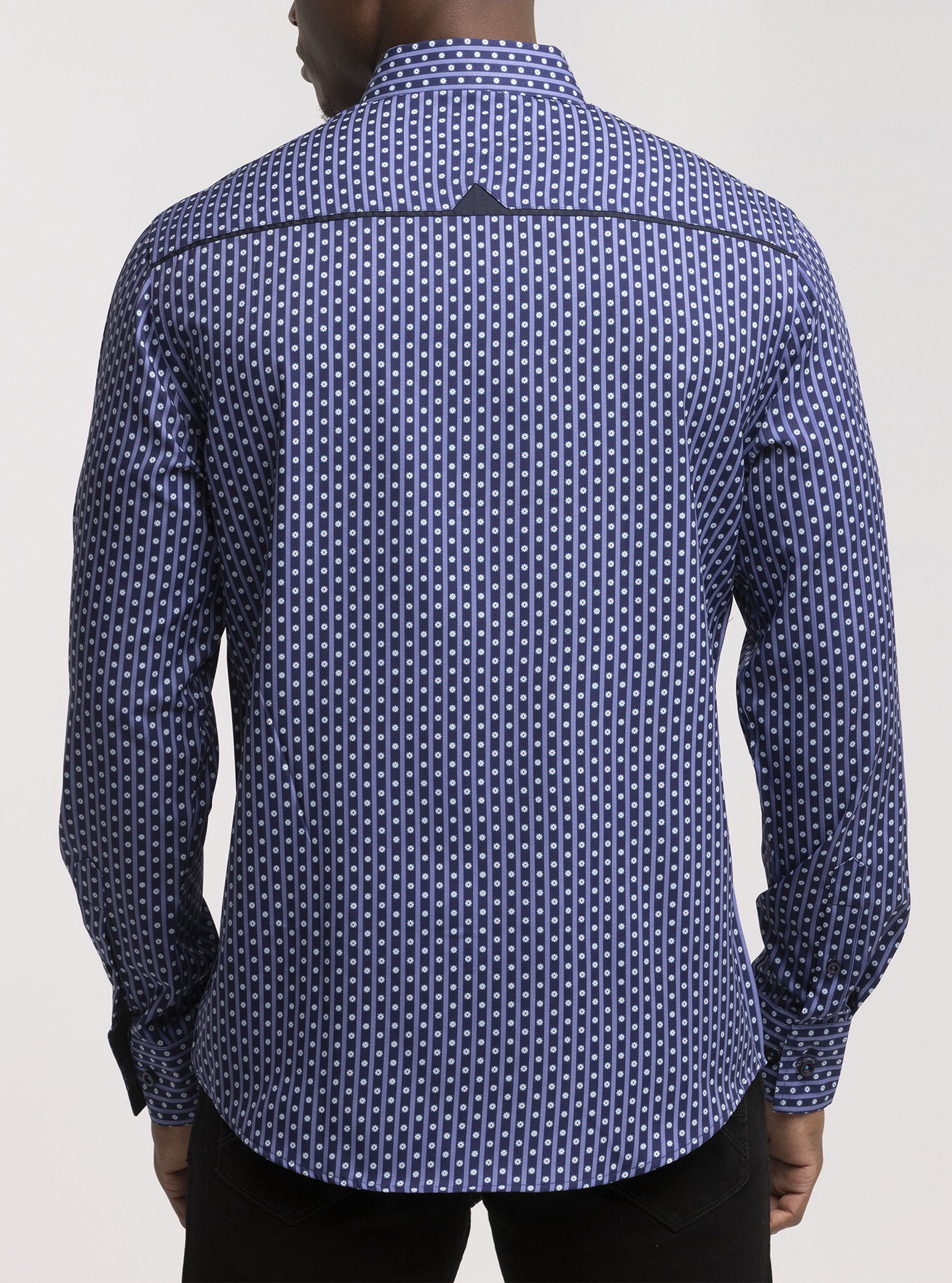 Effortless elegance starts here. This men’s long-sleeve stretch shirt is crafted from smooth microfiber with a refined daisy stripe print and contrast trims. Wrinkle-free design means no ironing, just polished style.