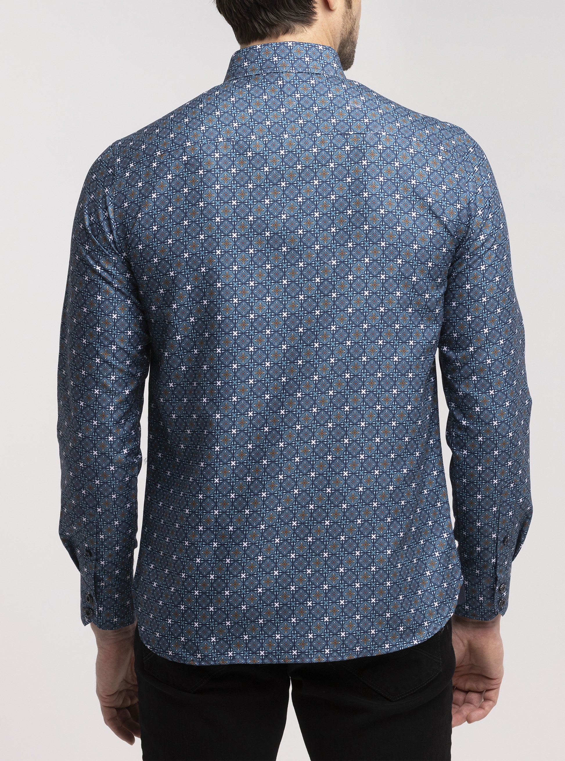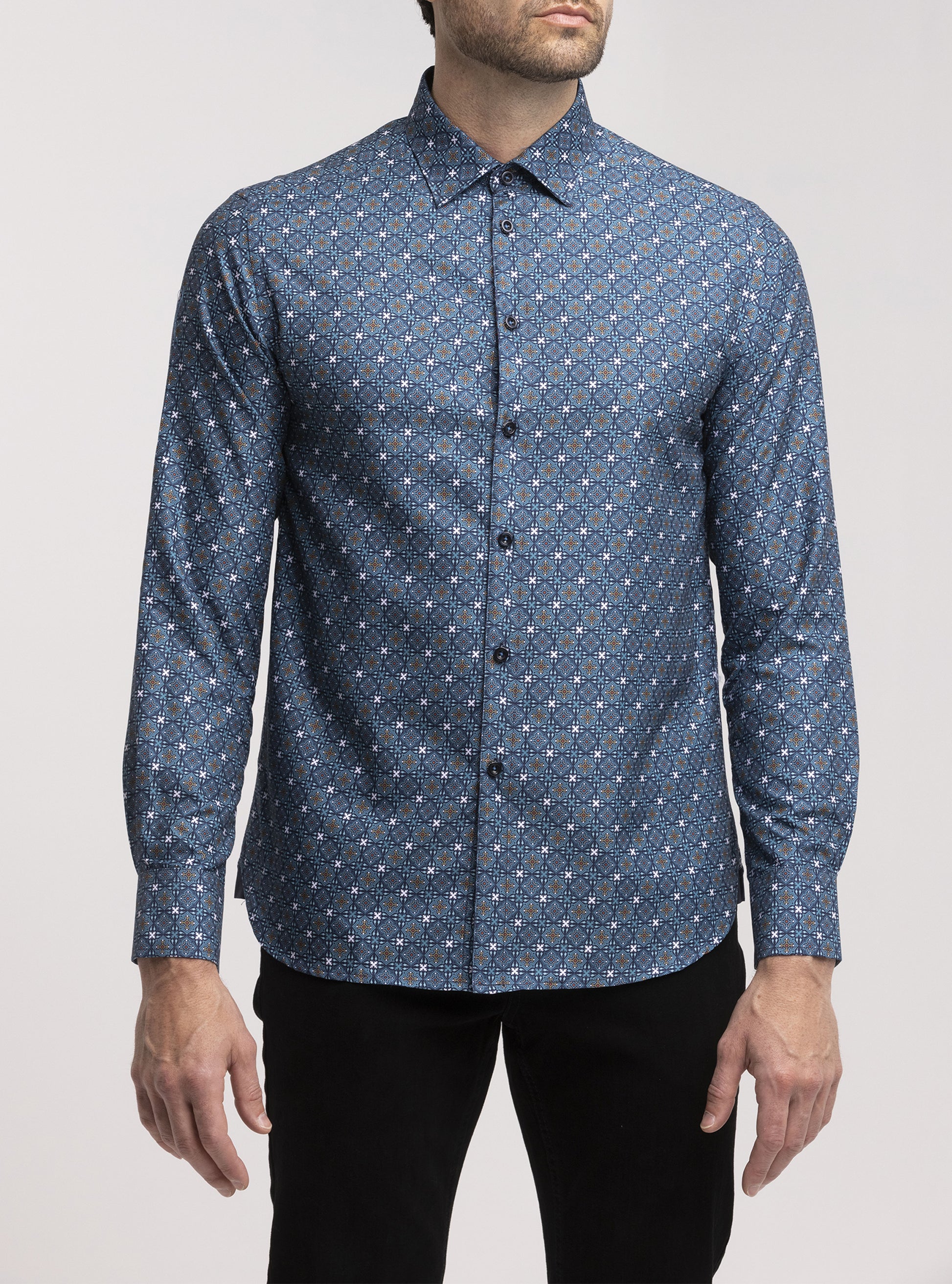 Enjoy easy care fashion with this microfiber long sleeve shirt featuring a chic ogive print and contrast trims. Wrinkle free design keeps you looking sharp without the hassle of ironing.