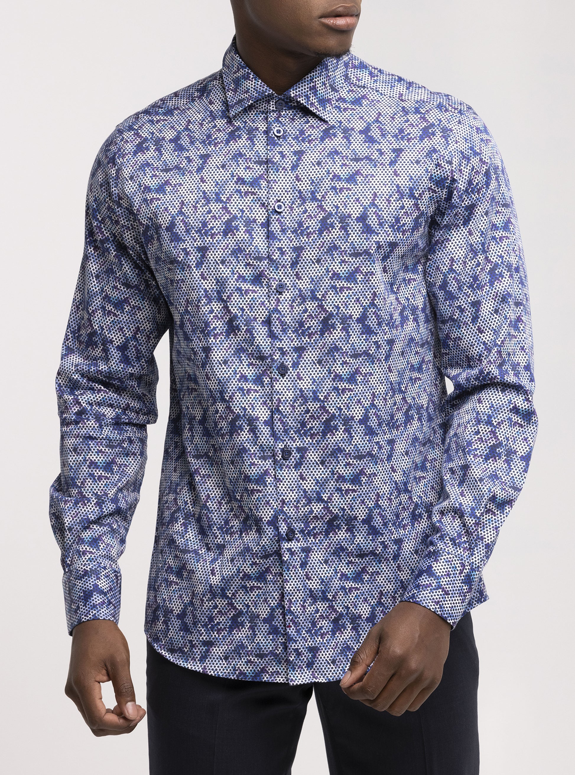 Upgrade your style with a stretch mercerized cotton shirt designed with a bold network print and sleek contrast trims. Stain resistant fabric makes maintenance effortless.
