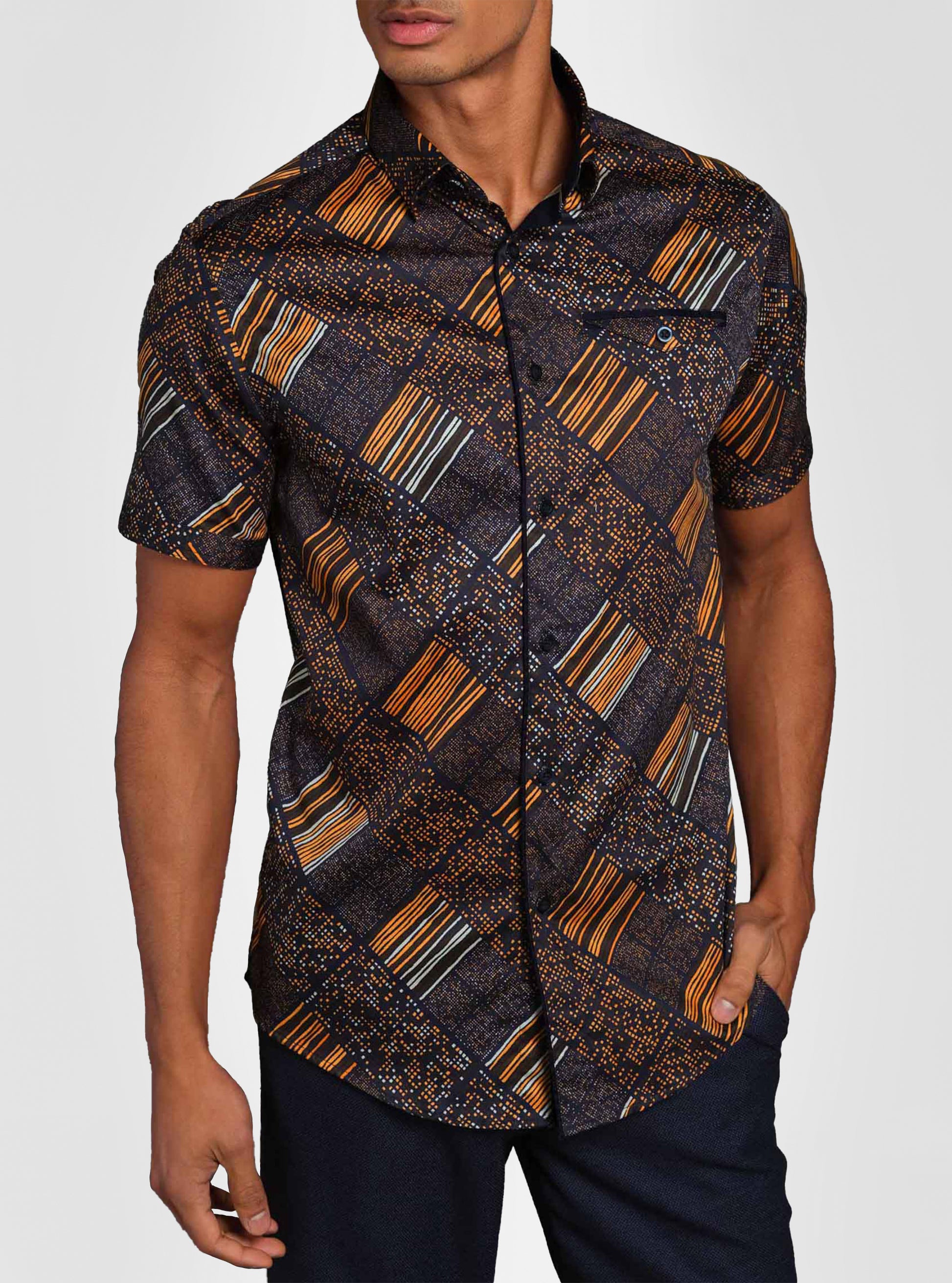 Elevate your style with our men's short sleeve shirt, crafted from luxurious mercerized cotton and featuring a bold squares print and contrasting trims. The semi-fitted cut creates a flattering silhouette that will make you stand out in any crowd.