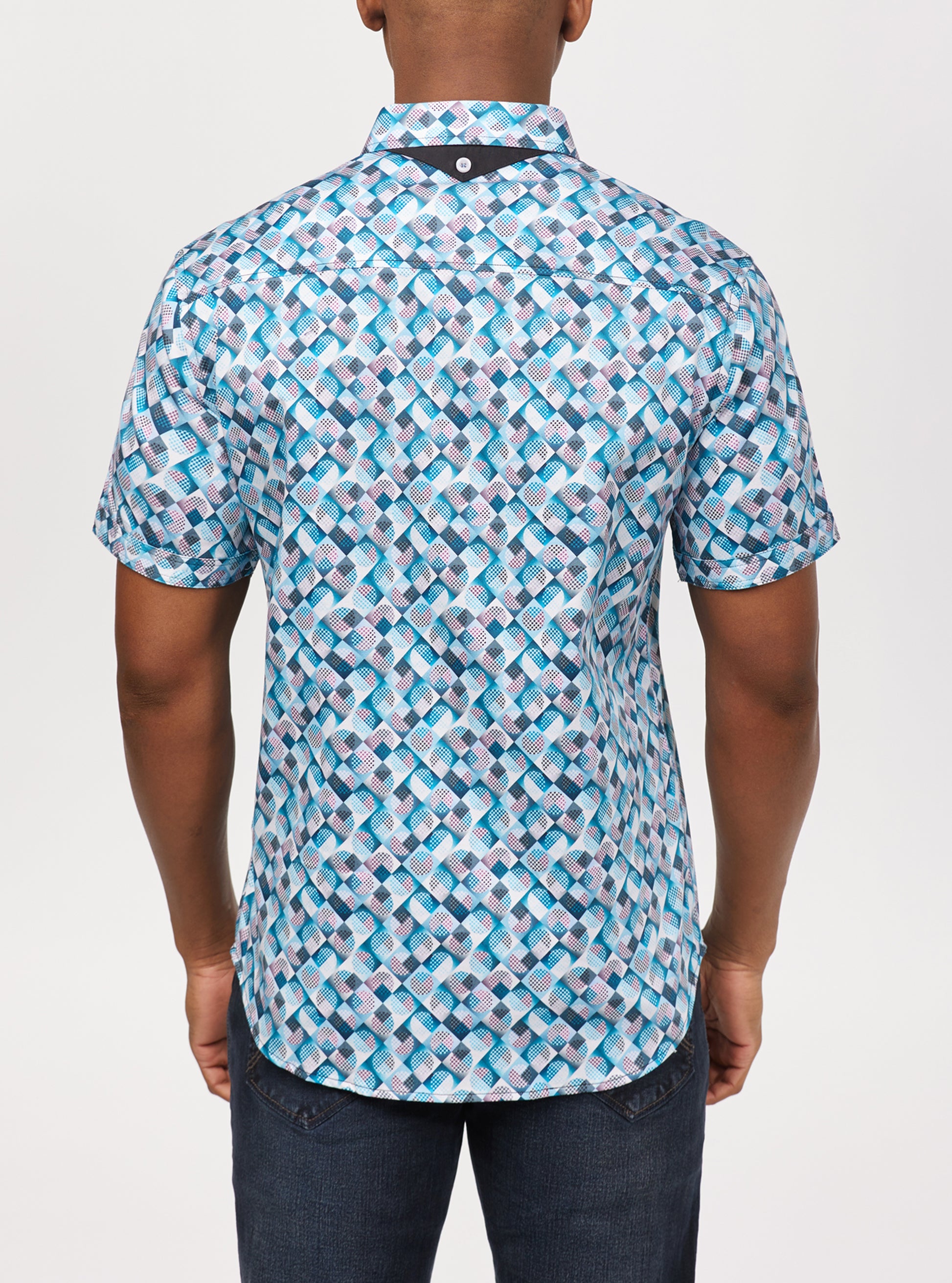 Enhance your casual wardrobe with our men's short sleeve shirt featuring a distinctive diamond gingham print. This stylish and comfortable shirt is perfect for any occasion, adding a touch of modern charm to your look.