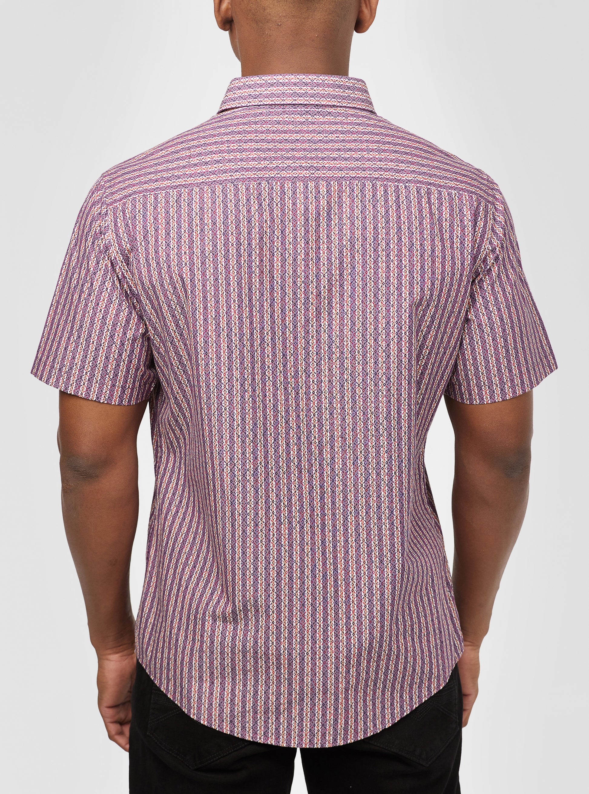 Discover the power and style of our men's short sleeve shirt, crafted with vibrant yarn-dyed stripes and featuring an all-over print and contrast fabric. The semi-fitted cut offers a sleek and modern look that will elevate your wardrobe.