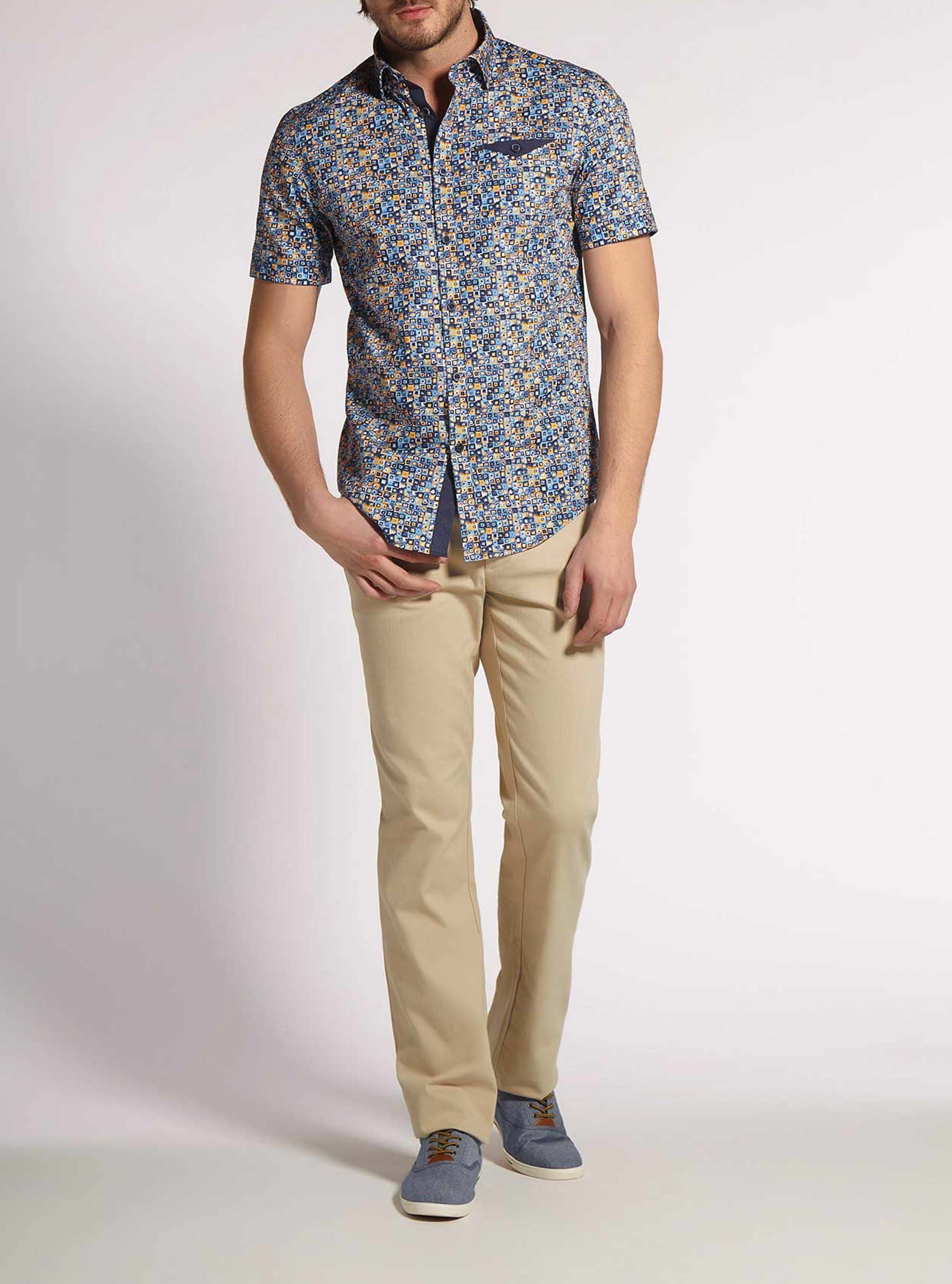 Spice up your wardrobe with our men's short sleeve shirt, featuring the vibrant New Havana print. Perfect for casual outings, this shirt blends comfort with a fun, tropical twist. Get ready to stand out!