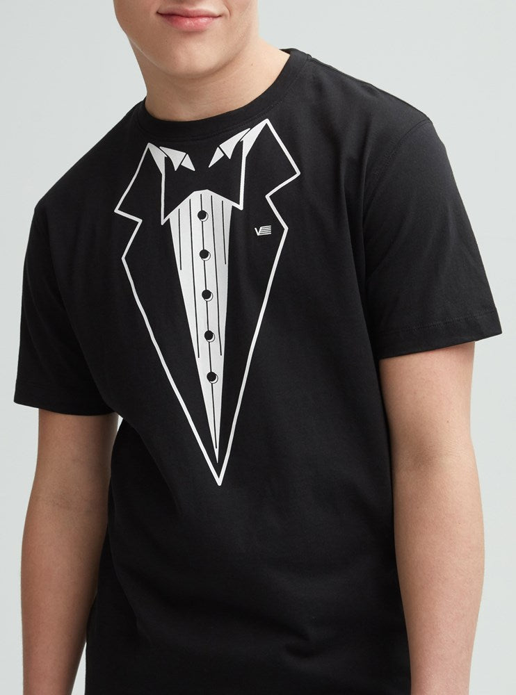 Turn heads with our men's short sleeve crew neck t-shirt, featuring a fun tuxedo print on the front. Perfect for casual outings or themed parties, this shirt combines comfort with a quirky twist. Get ready to stand out!