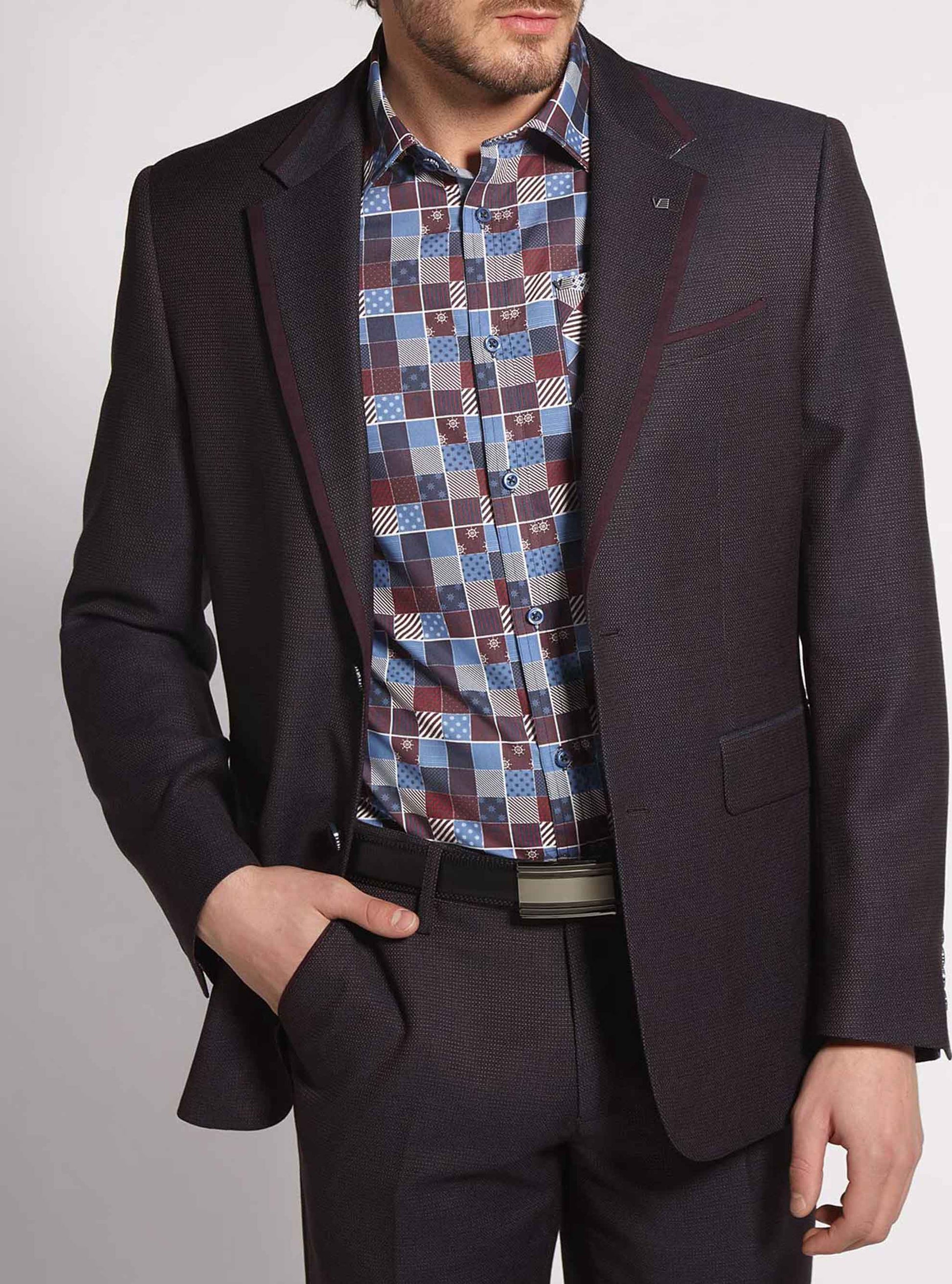 Step up your look with a men’s blazer in textured stretch fabric, featuring sharp lapel and pocket tipping plus bold contrast trims. Stretch armhole ensures all-day ease.