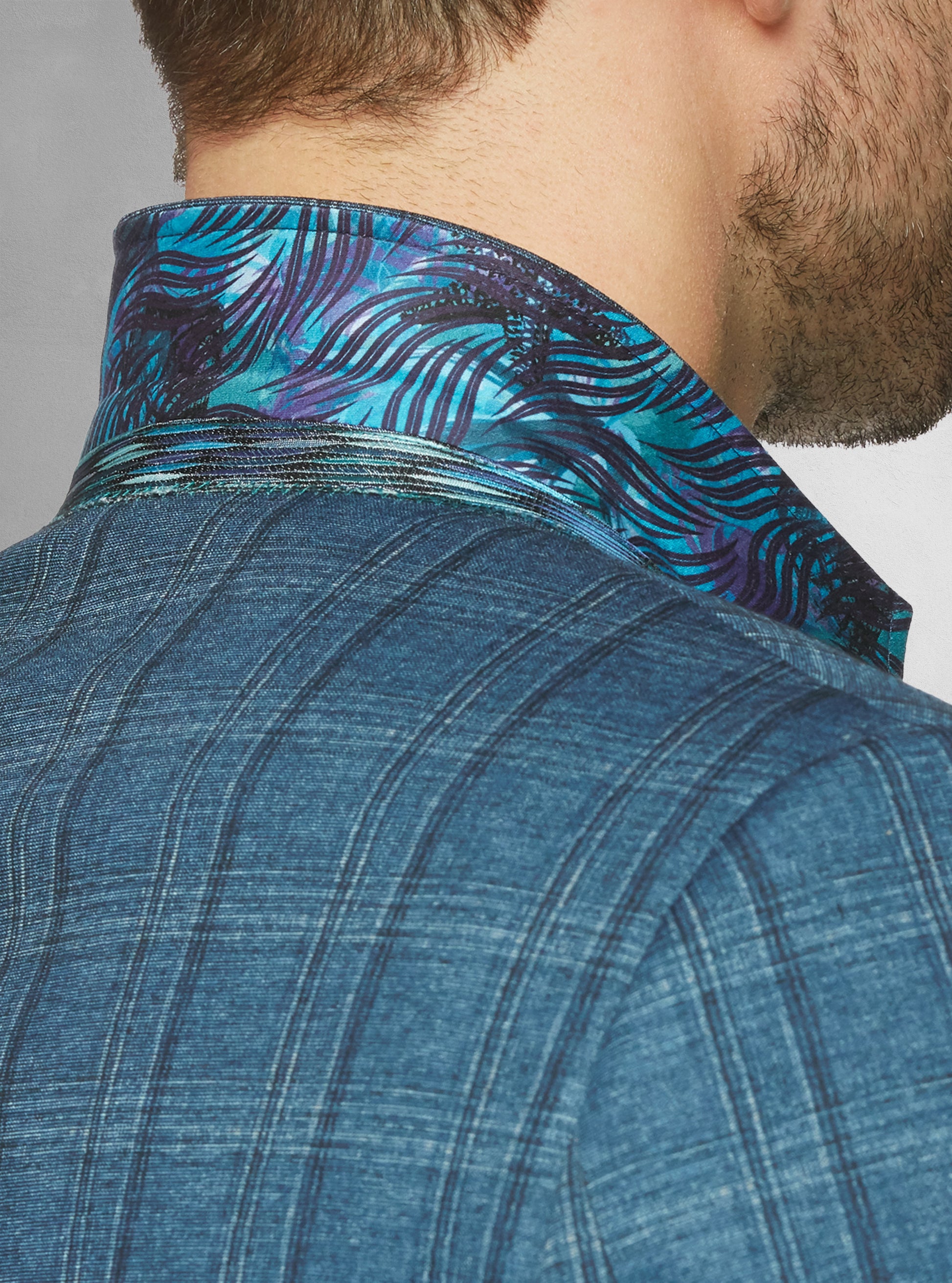Experience the ultimate comfort and style with our men's stretch blazer. Made from plaid knit fabric with contrasting inside trims and a stretch construction. The stretch lining and shoulder insert allow for maximum movement and comfort.